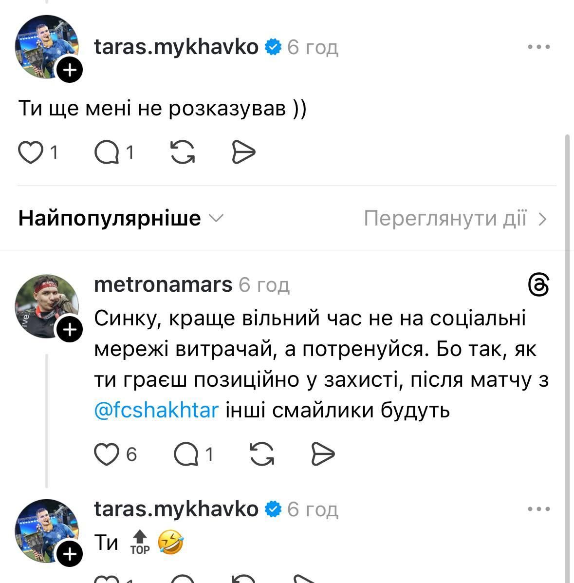 Он тоже оставил свою реакцию, на что получил на орехи от комментатора: "Тарас, когда команда пускает пять, то защитник – последний, кто должен такие смайлики ставить". Михавко резко отреагировал словами "Ты еще мне не рассказывал".