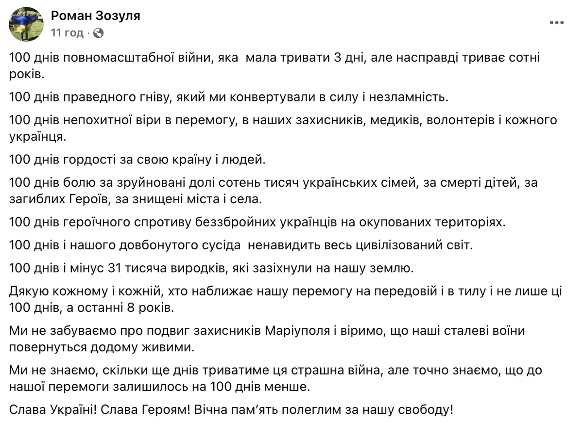 Благодарю каждого и каждую, кто приближает нашу победу на передовой и в тылу и не только эти 100 дней, а последние 8 лет. Мы не забываем о подвиге защитников Мариуполя и верим, что наши стальные воины вернутся домой живыми. Мы не знаем, сколько еще дней продлится эта страшная война, но точно знаем, что до нашей победы осталось на 100 дней меньше. Слава Украине! Слава Героям! Вечная память павших за нашу свободу!" – написал Зозуля в Facebook.