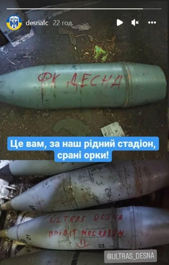 Фанаты оригинально подписали снаряды: "ФК Десна" и "Ultras Desna, привет моск*лям". "Это вам за наш родной стадион, сраные орки", – говорится в сообщении.