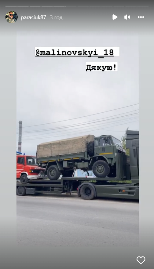 Участник российско-украинской войны и общественный деятель Владимир Парасюк рассказал, что Малиновский единолично приобрел для наших защитников военный грузовик. Соответсвующее видео он опубликовал в своем Instagram.