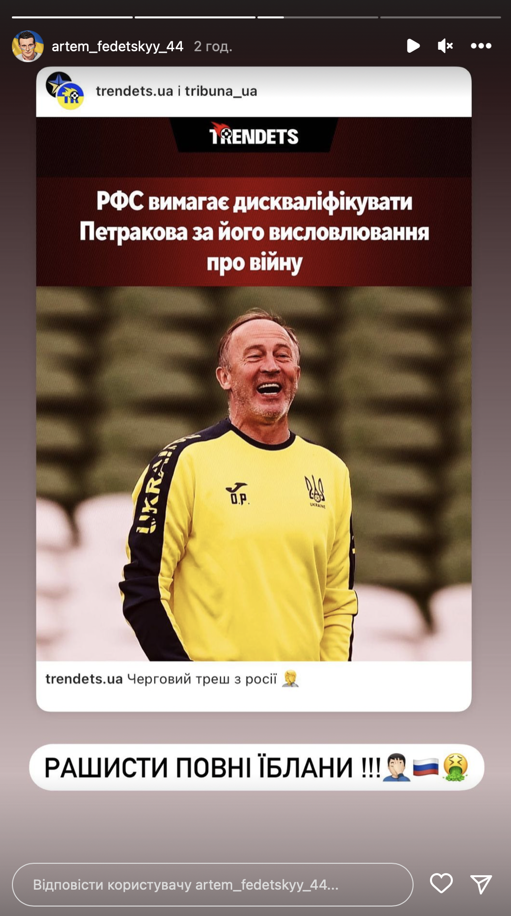 Артем Федецкий немногословно, но доступно отреагировал на бессмысленные заявления россиян. "Рашисты полные *бланы", – написал экс-футболист в Instagram.