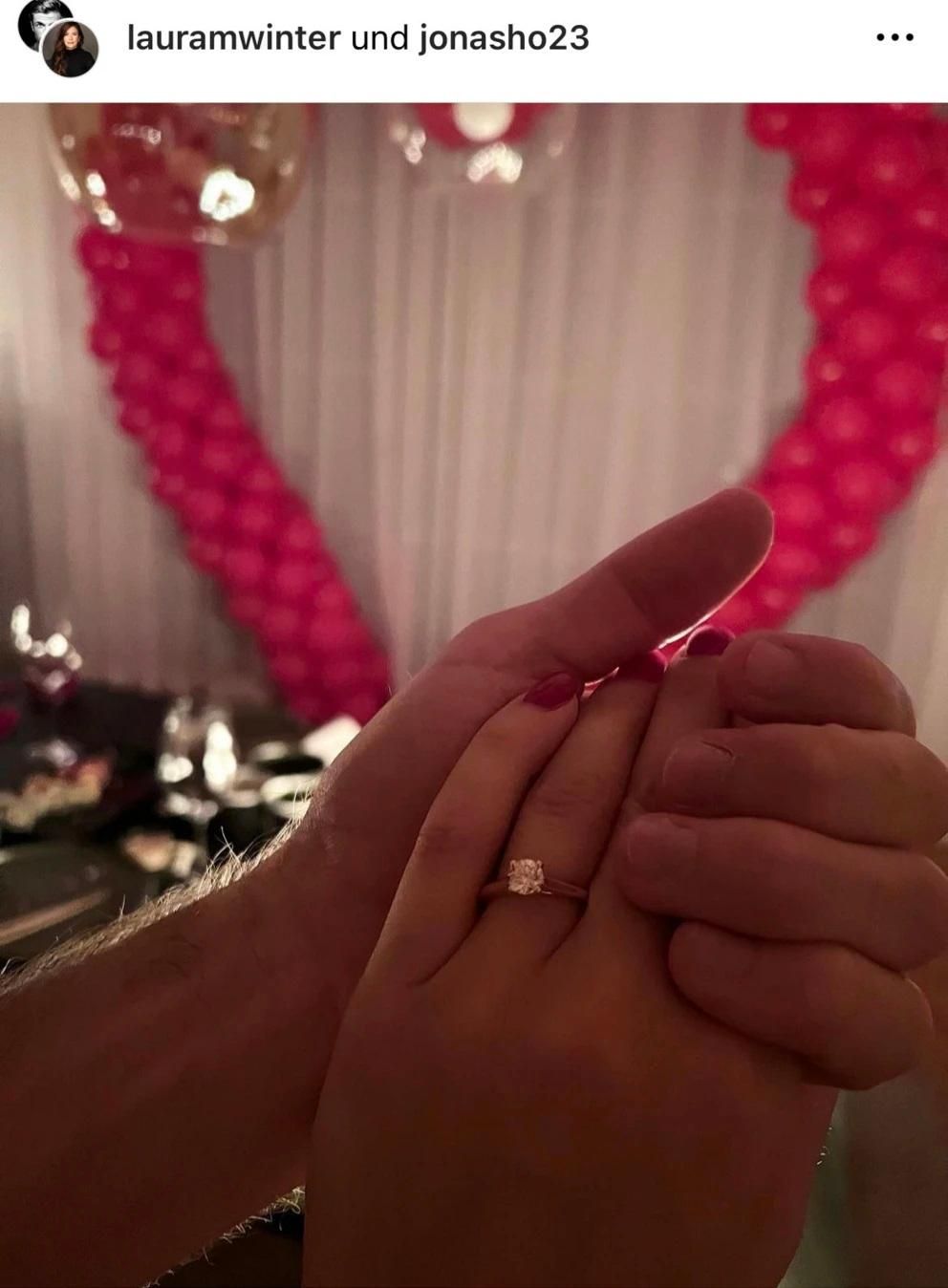 На фото молодожены запечатлели руку репортерши с бриллиантовым кольцом на пальце и воздушные шарики в форме сердца на фоне драгоценности. Вероятно, Йонас Хофман сделал предложение своей девушке во время праздничного ужина в честь дня рождения Лауры. Недавно ей исполнилось 29 лет.