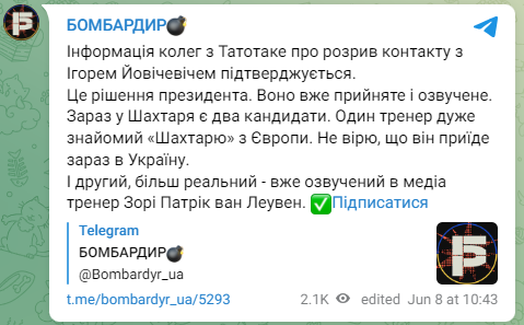 Сейчас у Шахтера есть два кандидата. Один тренер – из Европы, очень знакомый Шахтеру. Не верю, что он сейчас приедет в Украину. И второй, более реальный – уже озвученный в медиа Патрик ван Леувен", – сообщает журналист Роман Бебех в своем Telegram-канале.