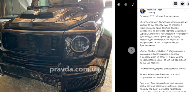 Наш источник сообщает, что вчера вечером общались с Ярославским по телефону за несколько часов до ДТП, и он был в нетрезвом состоянии. На фото авто Ярославского после того, как сбило насмерть человека", – написал в Facebook журналист Украинской правды Михаил Ткач.