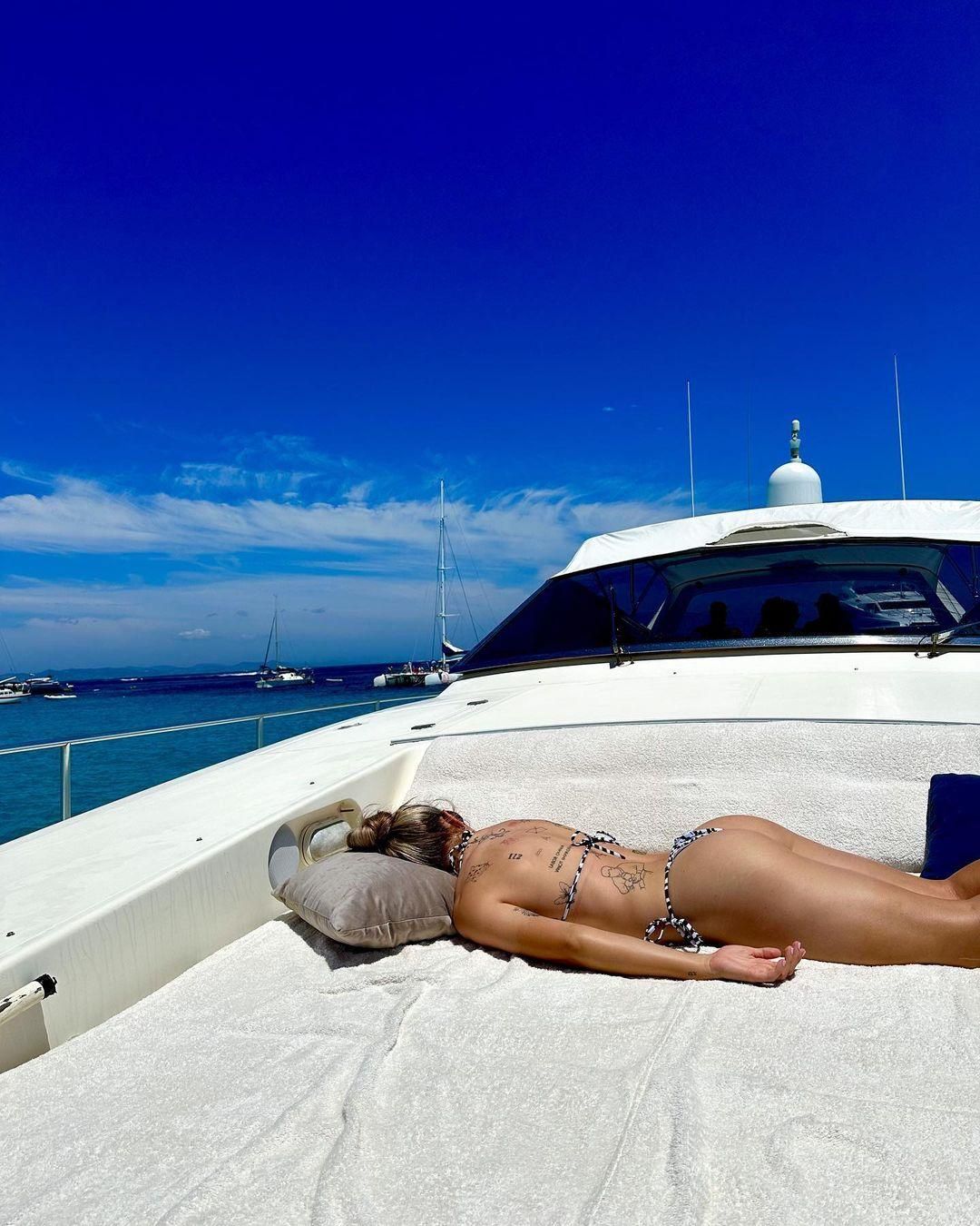 Обладательница "Золотого мяча" в 2021 и 2022 году развлекается на яхте в компании своих друзей. Для отдыха Алексия выбрала для себя бикини, повторяющий узор на теле зебры. Футболистка загорает под палящим солнцем Ибицы, демонстрируя аппетитные ягодицы и разнообразные татуировки, которые покрывают спину девушки. Она также имеет символы на руках, запястьях и голени.