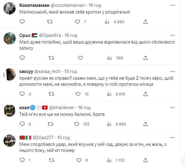 Некоторые начали насмехаться над ударами украинского хавбека. "Твой мяч все еще на моем балконе, брат", "Мне понравился удар, после которого мяч попал в мой сад. Но, к сожалению, мой кот от него умер", – комментируют подписчики. Некоторые же пишет: "Играй лучше Марселя". Также один из фолловеров посмеялся, что на самом деле эта учетная запись ведет не Малиновский, а его жена.