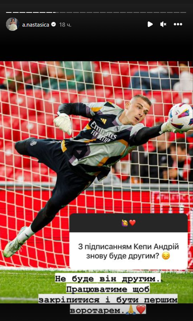 Соглашение Кепи рассчитано на один год без обязательства выкупа, впрочем, он уже выразил желание остаться в Мадриде и после завершения контракта. Таким образом, Андрей Лунин в этом сезоне, вероятнее всего, станет дублером испанца. Украинец недоволен своей ролью и желает доказать тренерам, что заслуживает большего. Об этом намекнула его жена на своей странице в Instagram.