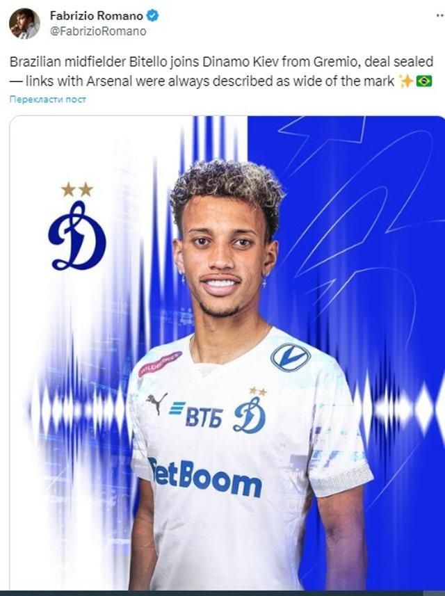 Дело в том, что топовый футбольный инсайдер Фабрицио Романо перепутал Динамо и сообщил на своей странице в Twitter, что Бителло присоединился к киевскому клубу На самом же деле бразилец стал новичком московской команды. Впоследствии Романо исправил ошибку.