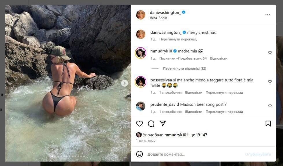 Украинский вингер Челси Михаил Мудрик, похоже, нашел новую симпатию. Футболист прокомментировал откровенное фото испанки Даниэлы Вашингтон подписью: "Madre mia". С испанского это переводится как "Боже мой".