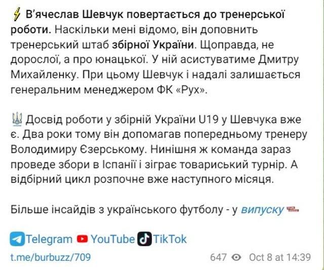 Шевчук войдет в тренерский штаб юношеской сборной Украины. Об этом сообщил журналист Игорь Бурбас в своих соцсетях.