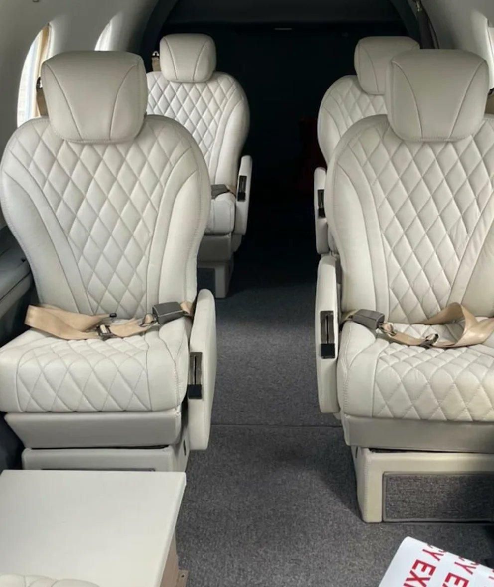 Известно, что этот 14-метровый самолет был построен в 2004 году и предлагает места для десяти человек (двое из них в кабине). Может разгоняться до 519 км/ч. На борту есть автопилот и навигационная технология от Garmin, а салон украшен в нежные кремовые цвета.