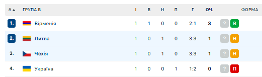 Таким образом, после первого тура Украина идет на последнем месте турнирной таблицы, а возглавляет группу Армения.