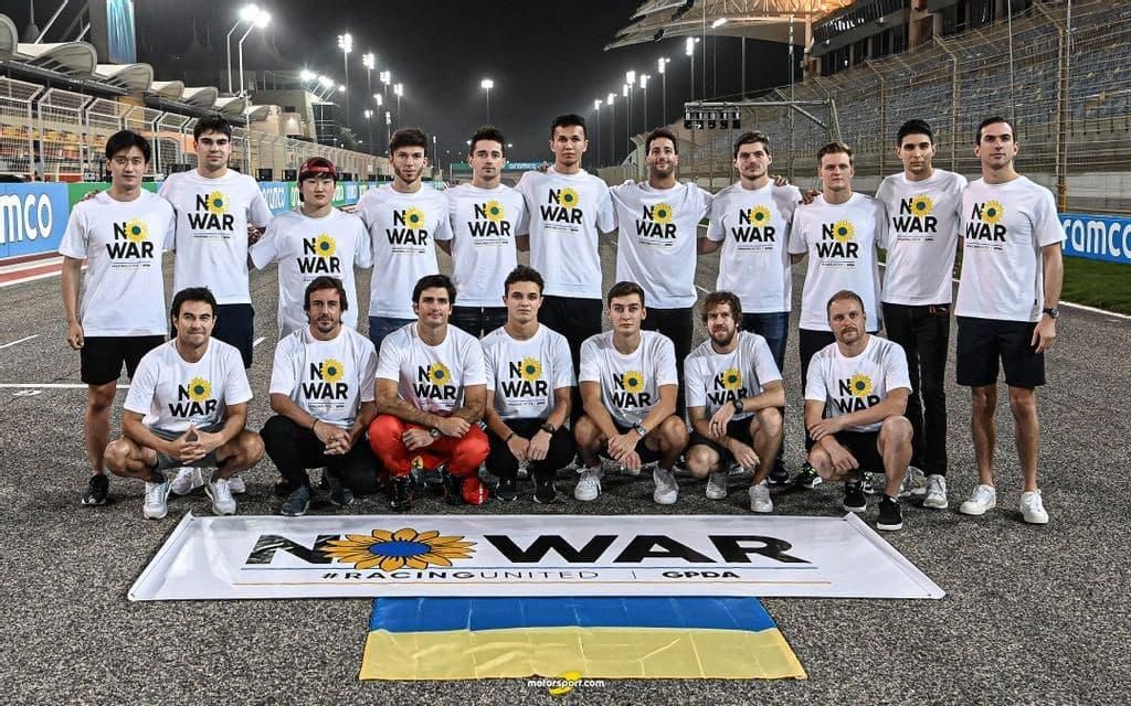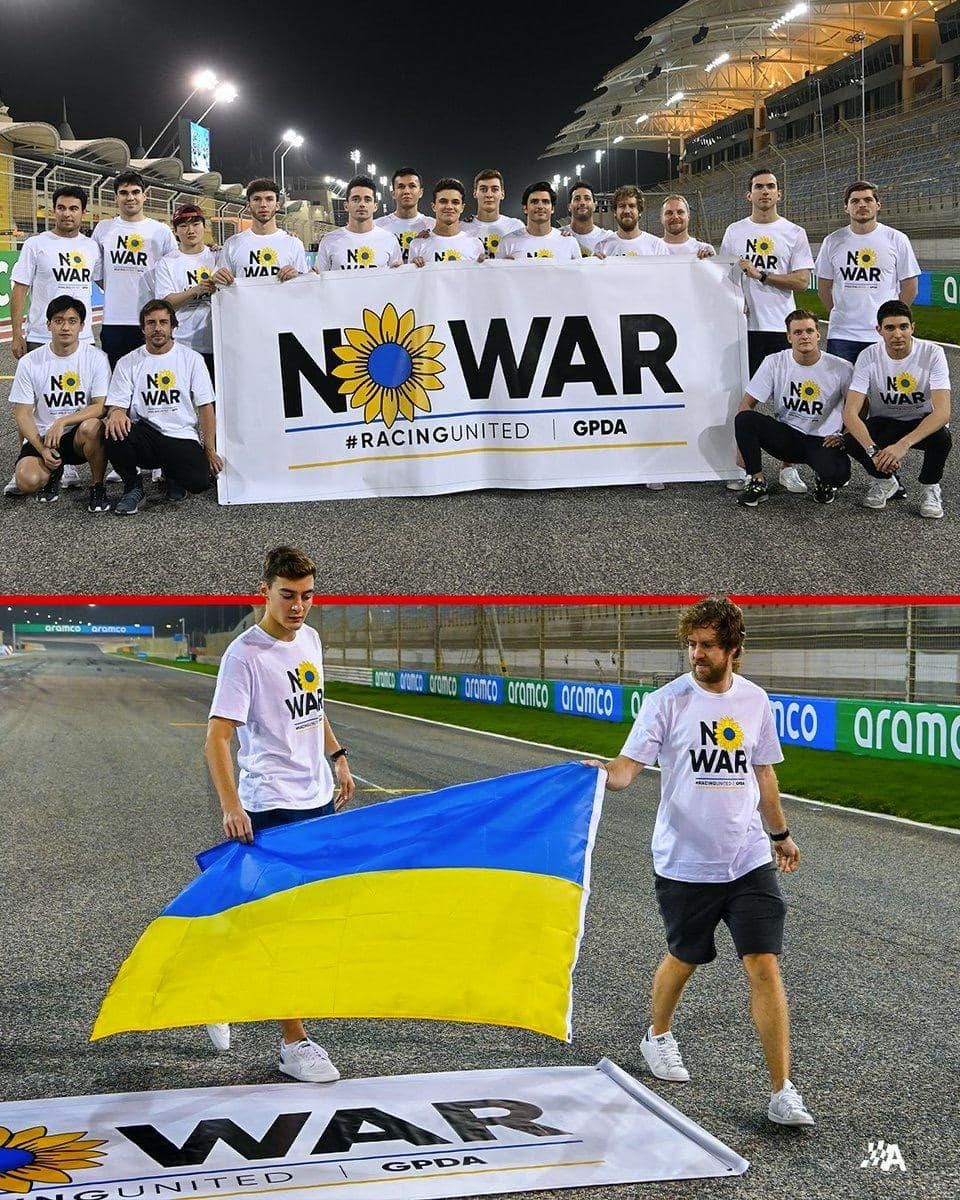 Перед началом тестов в Бахрейне гонщики вышли на трассу с украинским флагом и в футболках с надписью "No War", сообщил комментатор Макс Подзигун.