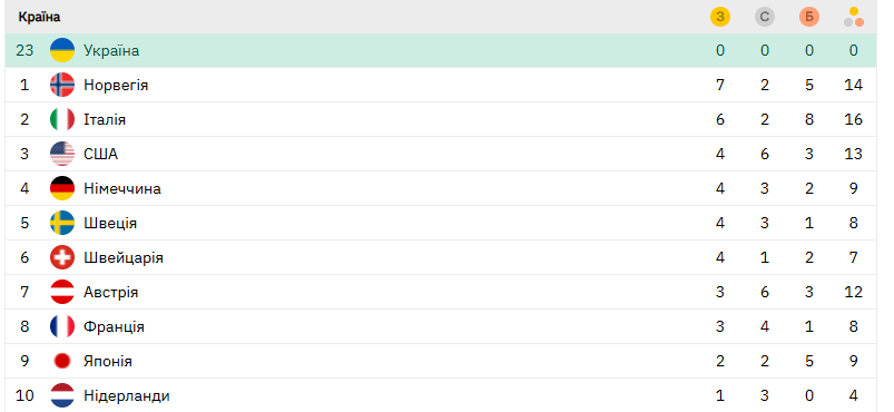 Топ-10 медального зачета (весь список доступен на Спорт 24 в разделе "Олимпиада-2026":