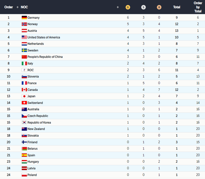 Наибольшее количество медалей в шестой день соревнований завоевали представители США (3 золота) и Австрии (2 золота и 1 серебро). Впрочем, лидерство в общем зачете сохранила Германия (6 золотых, 3 серебряные медали). Благодаря золоту в командном турнире по санному спорту она до сих пор опережает Норвегию. Австрия неожиданно поднялась на 3 строчку таблицы.