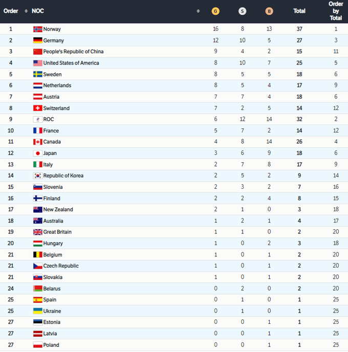 Больше всех медалей в Норвегии – 37, 16 из них – самого высокого сорта. Это рекордный показатель в истории зимних Игр пяти колец. Второе место командного зачета заняли немцы, третьими оказались хозяева Олимпиады китайцы.