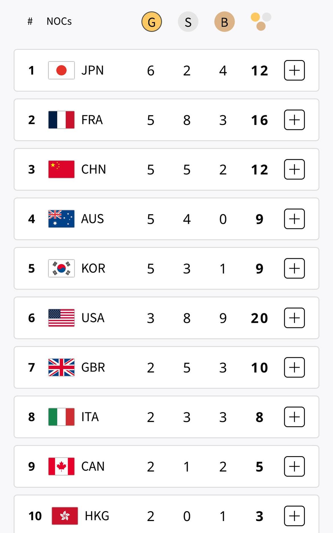 Наибольшее количество медалей по итогам трех дней имеют США – 20, но в медальном зачете идут лишь шестыми. Лидирует Япония с 12 медалями, среди которых аж 6 золотых.