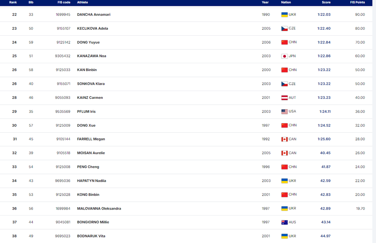 Гапатин, Малеваная и Боднарук заняли 34-е, 36-е и 38-е места соответственно, выбыв уже по итогам первого спуска. Добавим, что лучшим результатом сезона 2024/25 остается 12-е место Аннамари Данчи – пока что она единственная из украинских спортсменок, которая преодолела квалификацию.