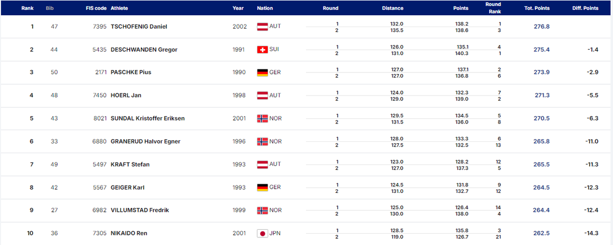 Первое место по итогам предварительного раунда занял австриец Даниэль Тчофениг, который ранее не побеждал на Кубке мира. Во второй попытке спортсмен тоже показал хороший результат, и остался на первом месте, набрав почти 277 баллов.