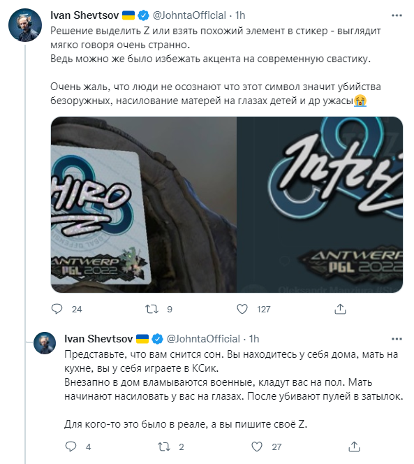Выход специальных стикеров приурочен к старту PGL Major Antwerp 2022. На наклейках "sh1ro" и "interz" ярко выделили букву "Z" – символ кровавых преступлений российских скотов в Украине, сообщяет Sport.ua.