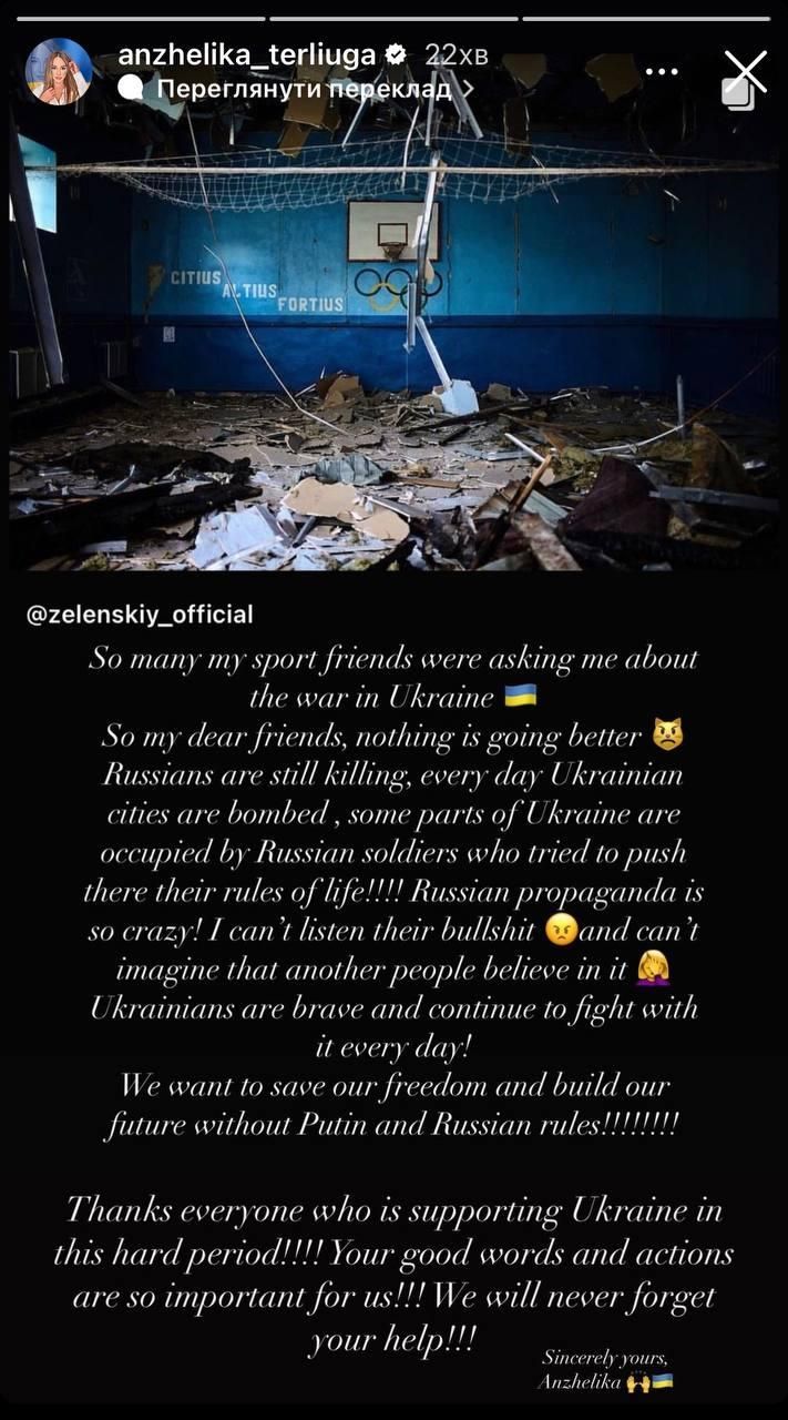 "Многие мои спортивные друзья расспрашивали о войне в Украине. Поэтому, мои дорогие друзья, ничего не идет к лучшему. Россияне до сих пор убивают, каждый день бомбят украинские города, некоторые части Украины оккупированы россией, чтобы засунуть туда свои правила жизни.