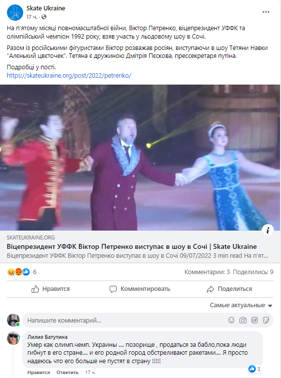Напомним, олимпийский чемпион 1992 года, а ныне вице-президент Украинской федерации фигурного катания Виктор Петренко принял участие в ледовом шоу "Красненький цветочек", проходившем в российском Сочи. Организатором спектакля была бывшая фигуристка и жена пескова Татьяна Навка.