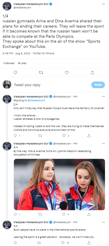 Кстати, Аверины на стадионе "Лужники" праздновали оккупацию Крыма. Таким людям не место на международной спортивной арене. Покинуть спорт – отличное решение. До свидания, мы не будем скучать по вам", – написал Гераскевич в своем Twitter.