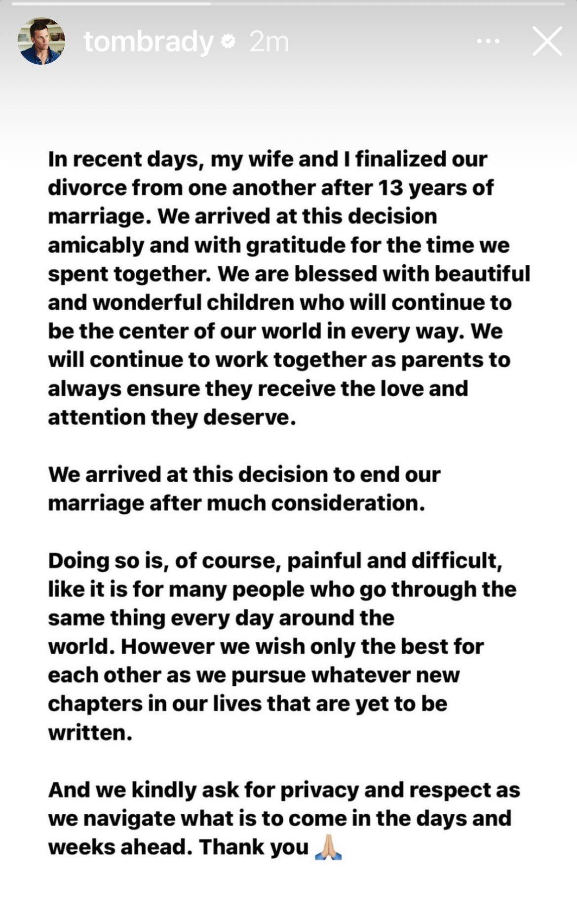 Естественно, это непростое решение. Но мы желаем друг другу только лучшего и начинаем новые страницы нашей жизни", – написал Брейди в соцсетях.