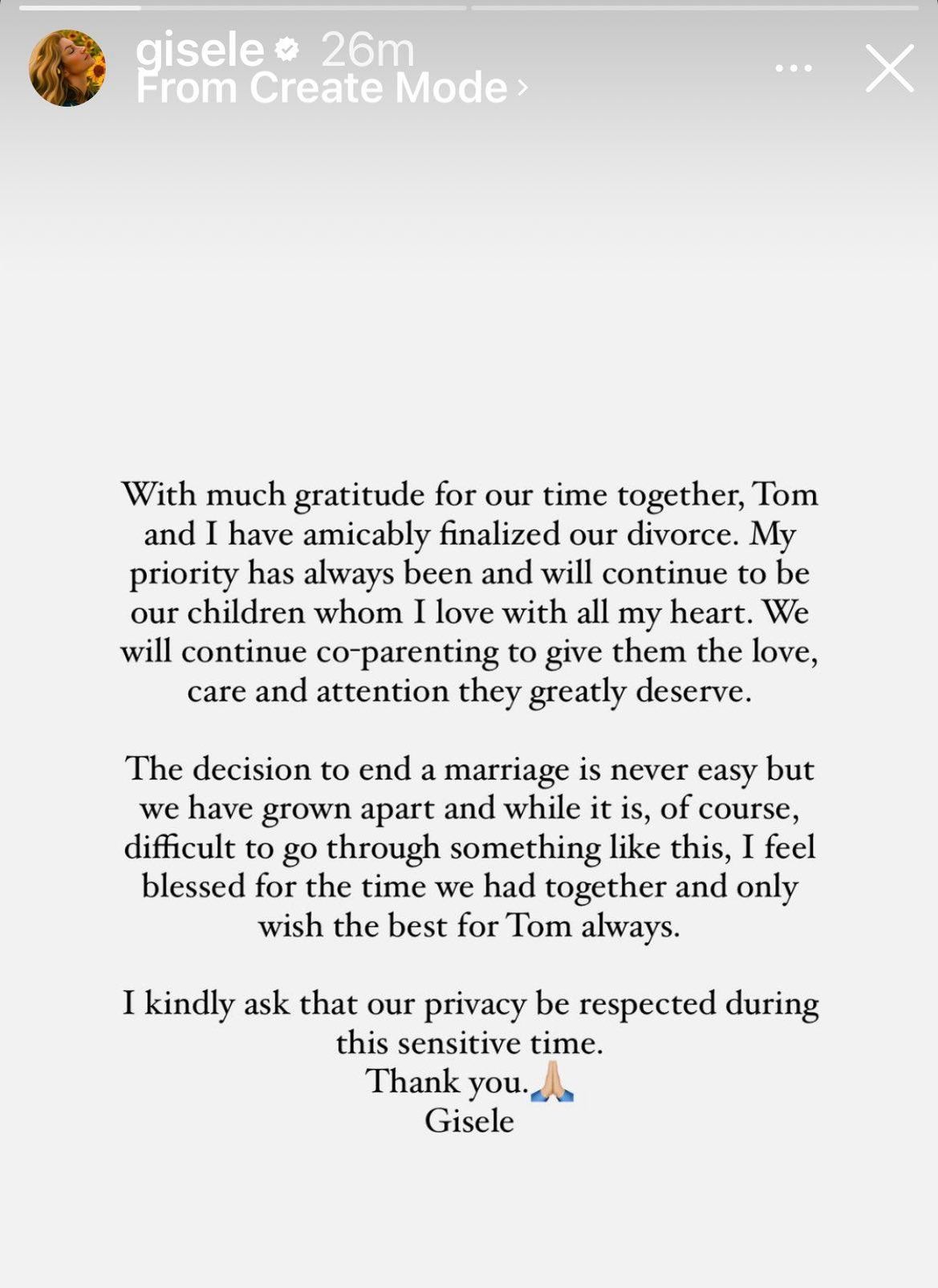 Жизель тоже опубликовала сообщение схожего содержания. Так что, очевидно, бывшим супругам удалось разойтись мирно, несмотря на то, что пришлось делить многомиллионное состояние.