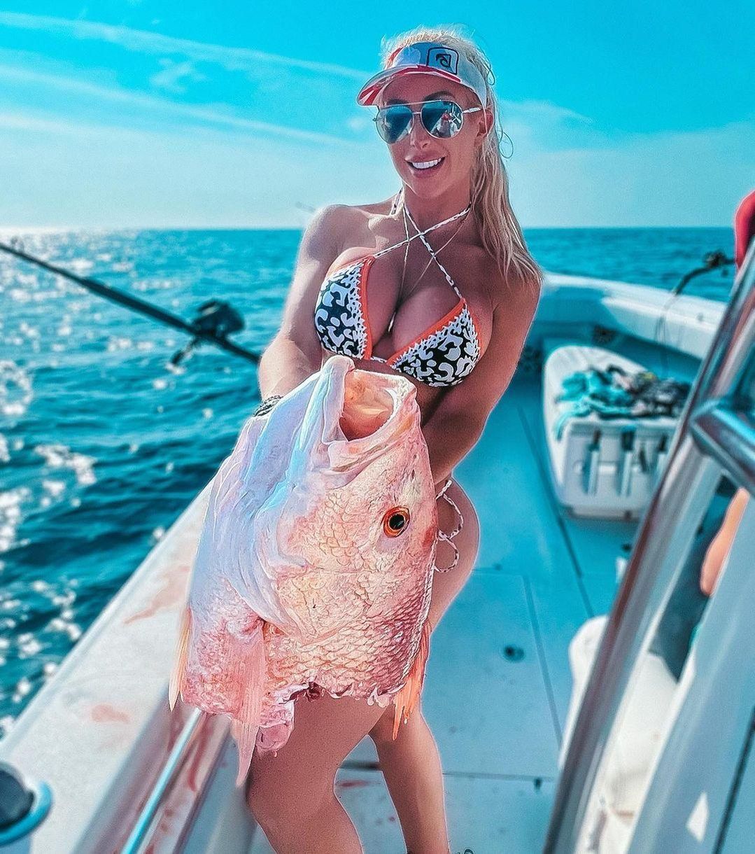 Особенно всколыхнула сеть фотография, на которой яркая блондинка позирует с рыбой, даже больше самой Лорен. Такой улов случился красавице на Канарских островах. В Instagram Лорен называют "русалочкой".