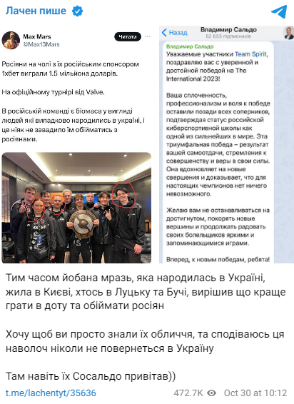 Известный украинский блоггер Игорь Лаченков так прокомментировал это в своем Telegram-канале : "Между тем йо*ана мразь, которая родилась в Украине, жила в Киеве, кто-то в Луцке и Буче, решила что лучше играть в "доту" и обнимать россиян. Хочу, чтобы вы просто знали их лица. Надеюсь эта сволочь никогда не вернется в Украину, там даже их "Сосальдо" поздравил".