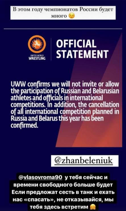 "В этом году чемпионатов России будет много. Роман Власов, у тебя сейчас и времени свободного больше будет. Если предложат сесть в танк и ехать нас "спасать", не отказывайся, мы тебя встретим", – написал Беленюк в своем Instagram.