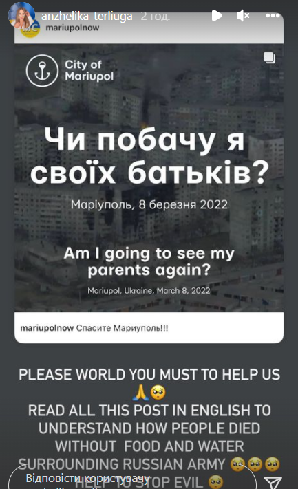 "Пожалуйста, мир, ты должен нам помочь. Прочтите этот пост на английском, чтобы понять, как люди умирают без еды и воды, окруженные российской армией. Помогите остановить зло", – написала Терлюга.