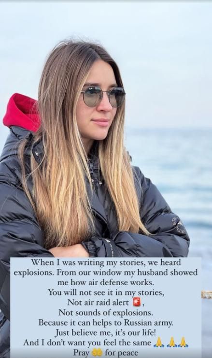 "Пока я создавала эту "сторис", мы услышали взрывы. Муж показал мне из нашего окна, что это сработала ПВО. Я не покажу этого в своих "сторис" – ни сигналов воздушной тревоги, ни звуков взрывов. Ведь это может помочь армии России. Просто доверьтесь мне, мы это переживаем... И я не хочу, чтобы кто-то чувствовал что-то подобное... Молюсь за мир.