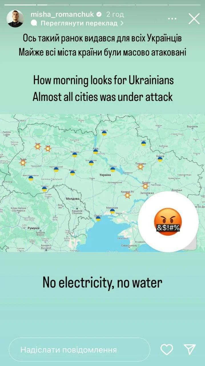 "Вот такое утро выдалось для всех украинцев. Почти все города страны были массово атакованы. Ни электричества, ни воды", – написал Романчук.