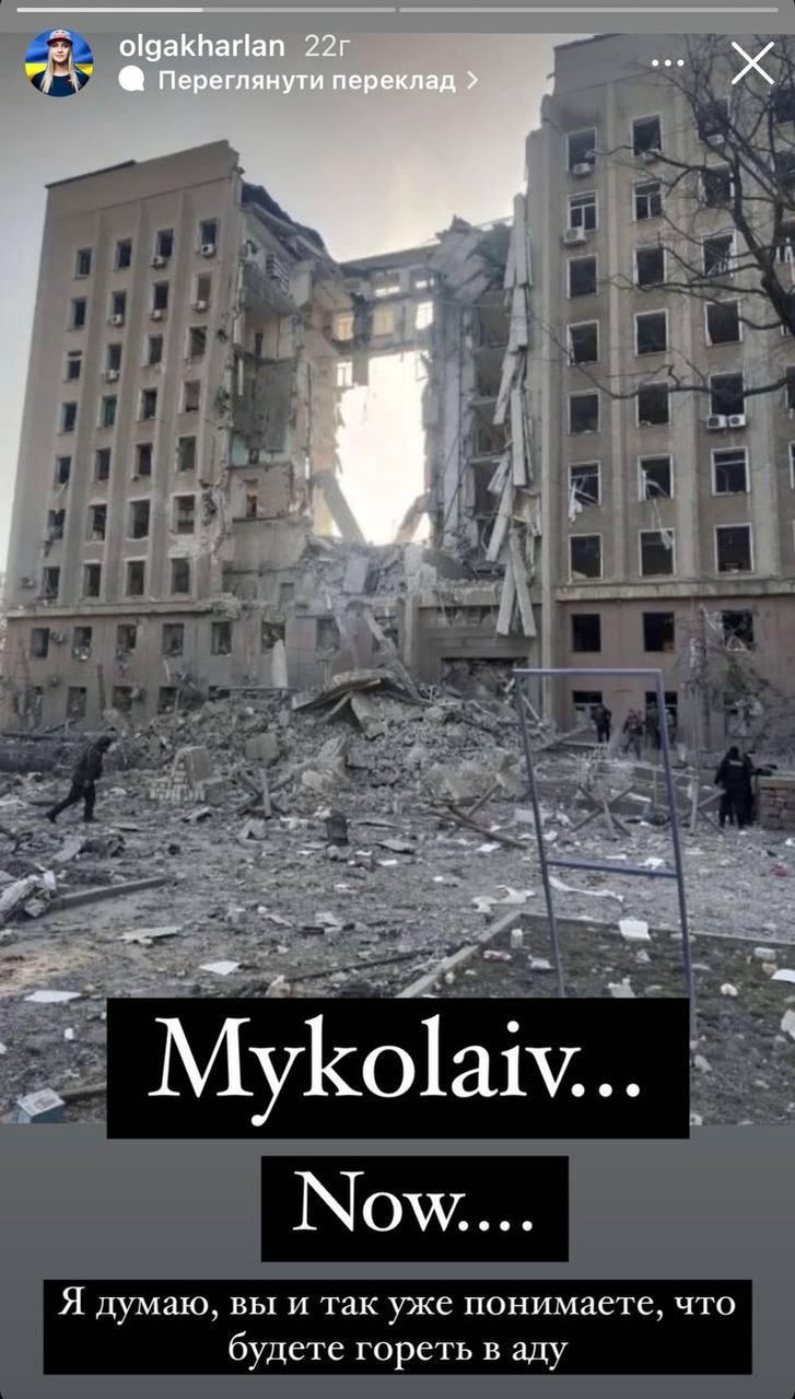 "Николаев сейчас... Надеюсь, вы и так уже понимаете, что будете гореть в аду", – написала Ольга Харлан.