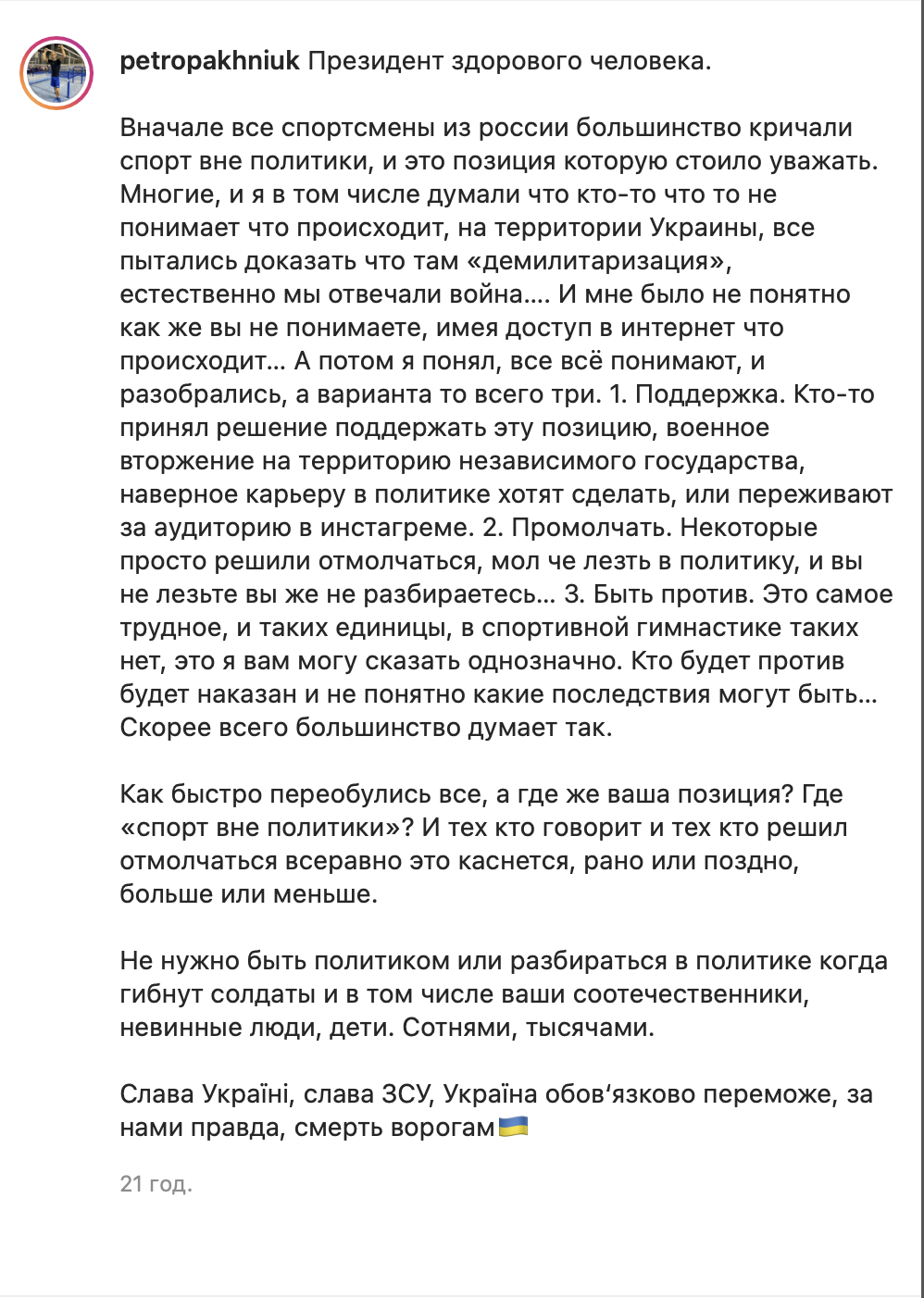 Как быстро переобулись все, а где ваша позиция? Где "спорт вне политики"? И говорящих и тех, кто решил отмолчать все равно это коснется рано или поздно, больше или меньше. Не нужно быть политиком или разбираться в политике, когда гибнут солдаты и, в частности, ваши соотечественники, невинные люди, дети. Сотнями, тысячами. Слава Украине, слава ВСУ, Украина обязательно победит, за нами, правда, смерть врагам", – написал Пахнюк в Instagram.