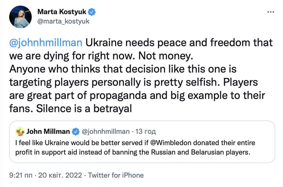 Джон Миллман заявил, что не стоило выбрасывать россиян и белорусов из соревнований, а нужно просто передать всю прибыль на помощь Украине. Марта Костюк сразу дала ответ на такое предложение.
