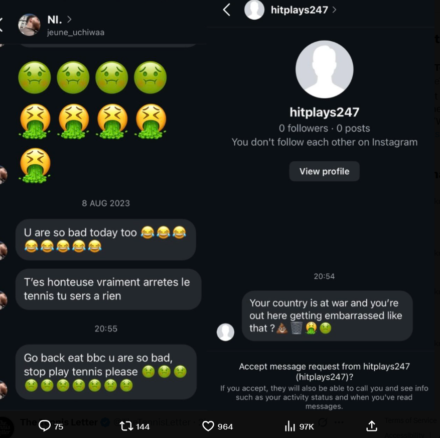 "Надеюсь, россия уничтожит Украину, как японка уничтожила тебя", "Заверши играть в теннис, пожалуйста", Ты сегодня худшая, как и всегда"...