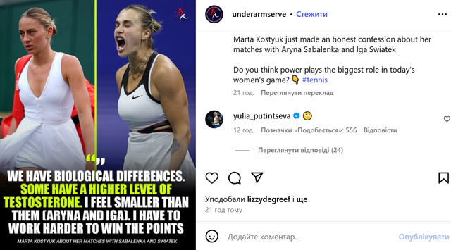 К слову, Путинцева недавно засветилась реакцией на слова Марты Костюк, которая предположила, что у таких теннисисток как Ига Свьонтек или Арина Соболенко высокий уровень тестостерона, что дает им преимущество в матчах с другими женщинами. Бывшая россиянка прокомментировала заявление украинки на одной из Instagram-пабликов, оставив эмодзи с закатанными глазами.