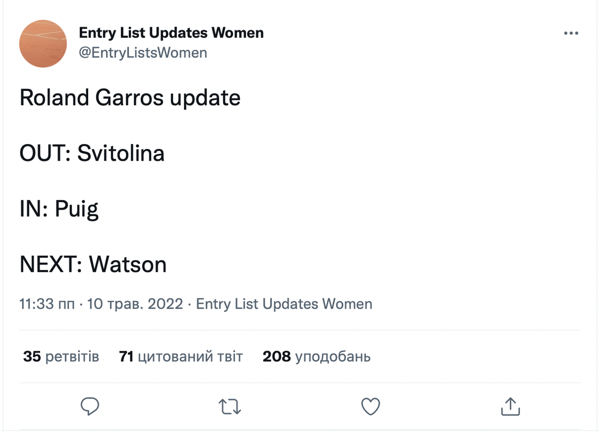 Турнир стартует 22 мая и продлится до 5 июня в Париже. Место Свитолиной займет теннисистка из Пуэрто-Рико Моника Пуиг. Ранее украинка уже пропустила два грунтовых турнира: WTA1000 в Мадриде и Риме.