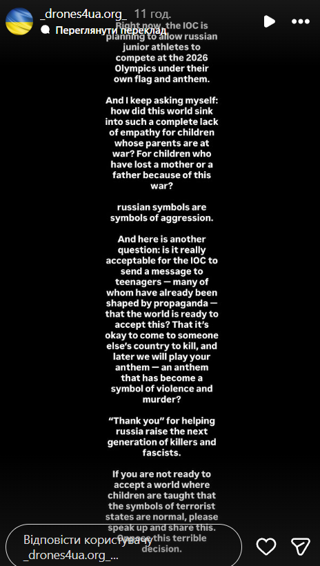"МОК хочет позволить юниорам из России и Беларуси соревноваться уже на следующей Олимпиаде под своим флагом. После этого я спрашиваю себя: когда этот мир погрузился в такое полное отсутствие эмпатии к детям, чьи родители воюют, или потеряли близких? Российские символы связаны с агрессией.