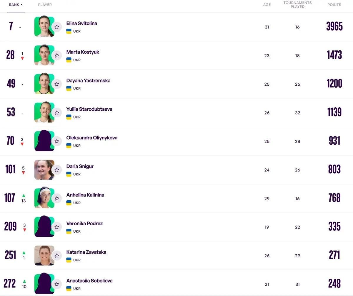 Среди украинок Марта Костюк потеряла одну строчку и теперь занимает 28-е место. Без изменений остались позиции Даяны Ястремской и Юлии Стародубцевой – 49-е и 53-е места соответственно.