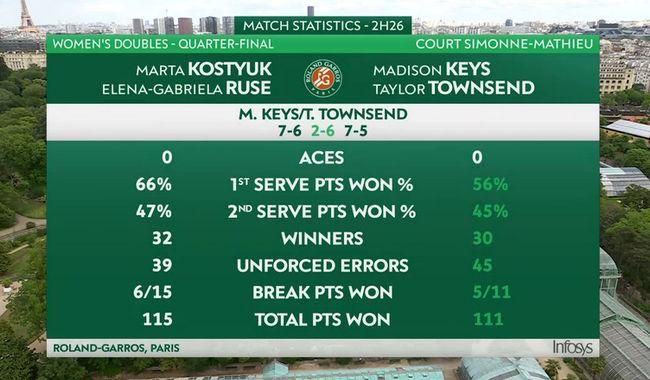 Марта Костюк / Елена-Габриэла Русе – Мэдисон Киз / Тейлор Таунсенд – 6:7(5), 6:2, 5:7