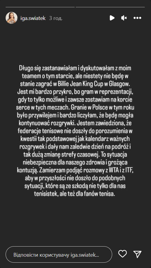"Я много об этом думала и не раз обсудила всё со своей командой. Я не приму участие в Кубке Билли Джин Кинг в Глазго, и мне обидно за это. Очень сожалею, ведь я играю за Польшу всегда, когда это возможно, и каждый раз выкладываюсь на сто процентов.