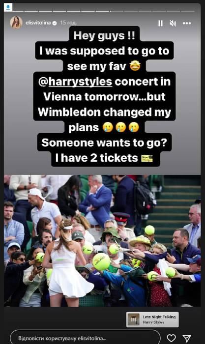 "Эй, люди! Сегодня я должна была пойти на концерт моего любимого Гарри Стайлса в Вене, но Уимблдон спутал мои планы. Кто-то хочет пойти? У меня есть два билета", написала теннисистка на своей странице в Instagram.