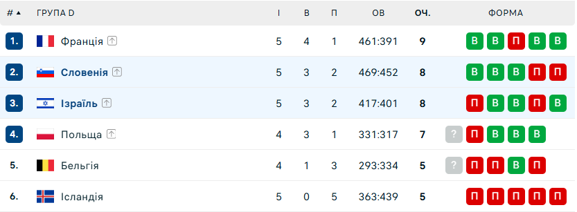 Словенія піднялася на другу сходинку турнірної таблиці й гарантовано зіграє в плей-офф. Ізраїль поки що третій, принаймні поки свій вечірній матч не зіграла Польща, але теж забезпечив собі місце у наступному раунді.
