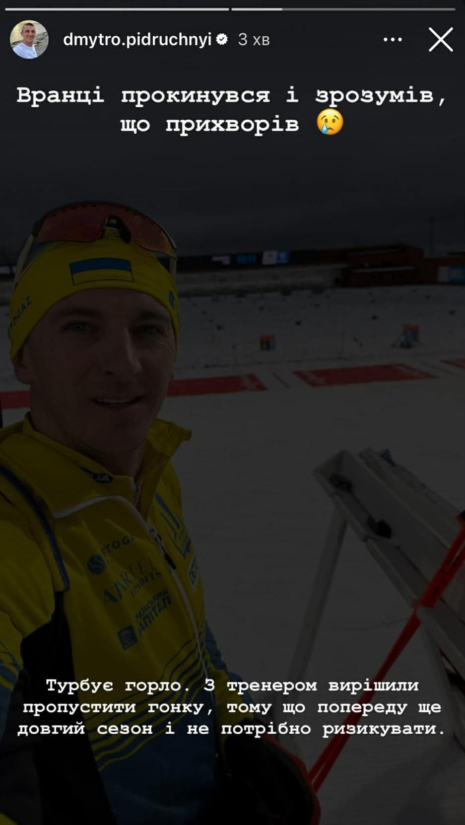 "Зранку прокинувся і зрозумів, що прихворів. Турбує горло. З тренером вирішили пропустити гонку, тому що попереду ще довгий сезон і не потрібно ризикувати", – поділився Підручний зі своїми підписниками в Instagram.