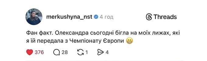 "Фан факт: Олександра бігла в моїх лижах, які я їй передала з чемпіонату Європи", – зазначила Анастасія.