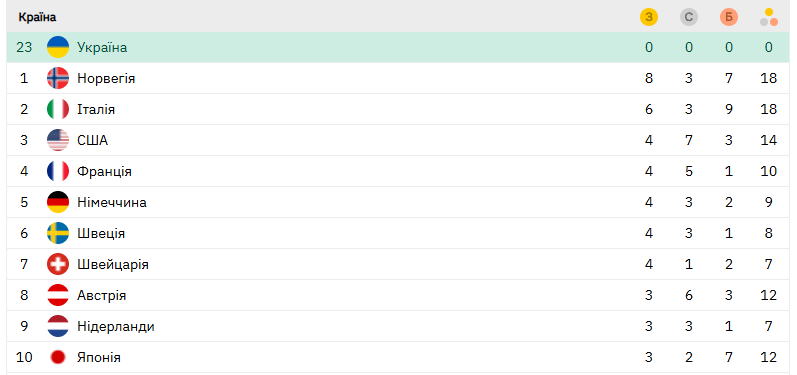 У медальному заліку продовжує лідирувати Норвегія, однак її вже наздогнала Італія. У обох країн по 18 нагород (увесь список доступний на Спорт 24 у розділі "Олімпіада-2026").